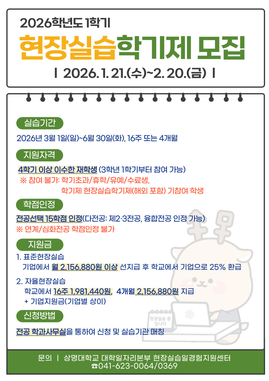 [현장실습·일경험지원팀] 2026학년도 1학기 현장실습학기제 시행 공고